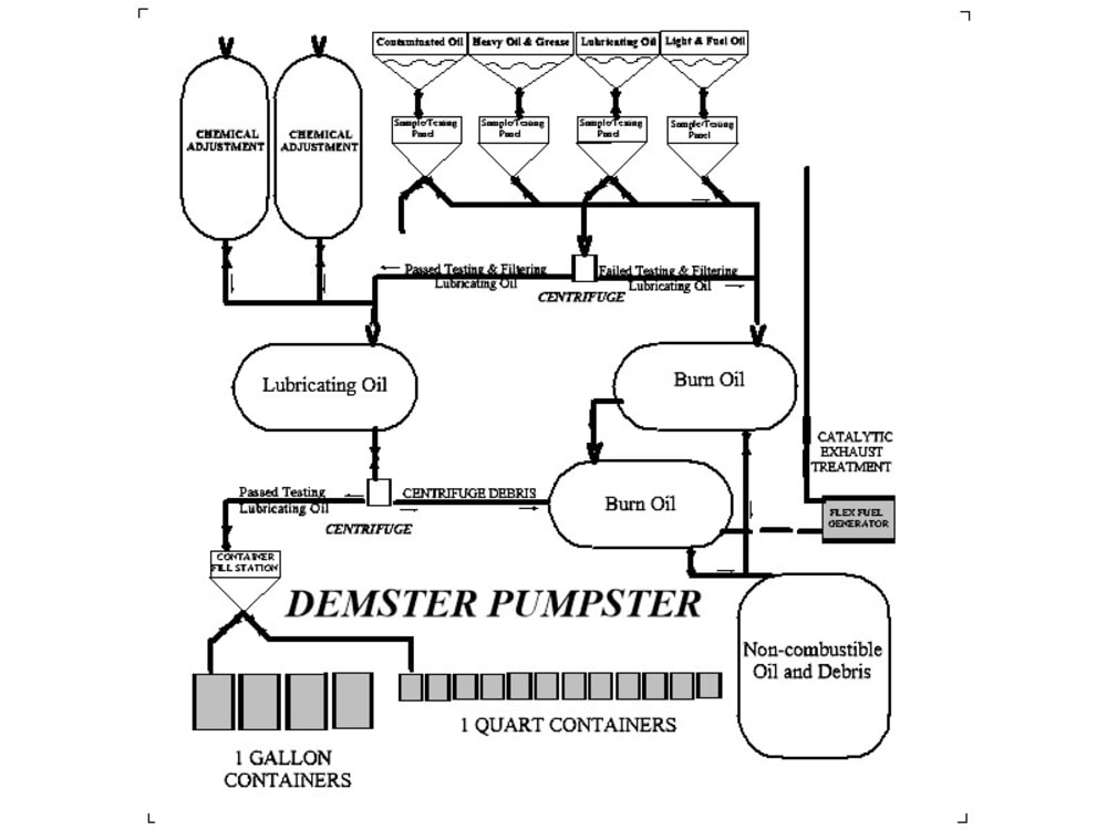 Every automotive dealership and filling station could benefit from the Demster-Pumpster as the industry phases out ICE vehicles. Literally millions of gallons of oil would need not be obtained by drilling, only to be disposed of later. As the attached illustration demonstrates, this invention is a fully automated oil processing system that provides a green alternative to ICE waste oil disposal. From an economic and convenience perspective this invention offers substantial incentives by creating a "vending machine" that would be more productive than solar panels and windmills in terms of impact on climate change. Industrial and commercial users down to individuals would all find benefits from its use. Furthermore, it uses integration of technology that has been proven to be successful and effective.