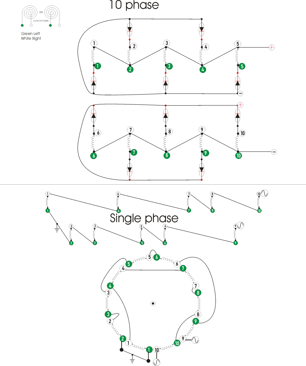 Indeed each coil can use a diode to grasp a quarter of the potential showing ten phase AC. But all the magic happens when the 10 phases are added through residence wiring to become one big phase. Changing them from parallel to series creates the wanted single phase.