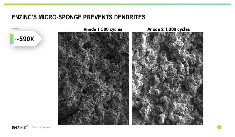 Enzinc, in concert with the US Naval Research Laboratory, has developed a novel zinc metal sponge electrode that offers three distinct advantageous for an alternative chemistry especially over other zinc electrode approaches. The sponge structure eliminates dendrite growth extending the cycle life in the thousands. It’s high surface area extends the zinc utilization by two times over conventional zinc giving the resulting battery higher specific energy and energy density. For example, for a nickel zinc version the specific energy is greater than Lithium Iron Phosphate (LFP) batteries (130 Wh/kg vs 100 Wh/kg). And because this is a structural solution the electrode is cathode agnostic. This means it can deliver a family of batteries. The zinc sponge anode can be coupled with nickel, silver, manganese, and carbon for a zinc-air battery.