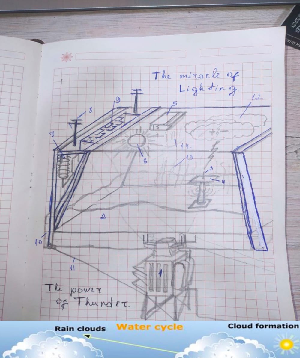 As we were taught at a young age, this circular movement is a part of nature, it is evaporation. First of all, the sun or a special heating system should evaporate the water. After that, after creating steam, the next thing is to collect the steam and prevent it from turning into water. For instance, steam is easy to circulate, so I gave it a certain layer. i.e. similar to the call to prayer. And I believe this will prevent evaporation. And devices from both sides help create a cloud. After the formation of clouds, it will move on the next stage, it is time to positive and negative proton and neutrons are rarefied, thunder will occurs, as the theory proved in science that lightning has a tendency to the iron body in the object. It should be tied to the exact white colored thing. The thunder does little work, and even more lightning - the high current frequency generated by the needle will transmit to a special distributor. After this process, the current is ready to be sent to the transformer and for usage of people households. This project can be the reason for revolution of energy production.
