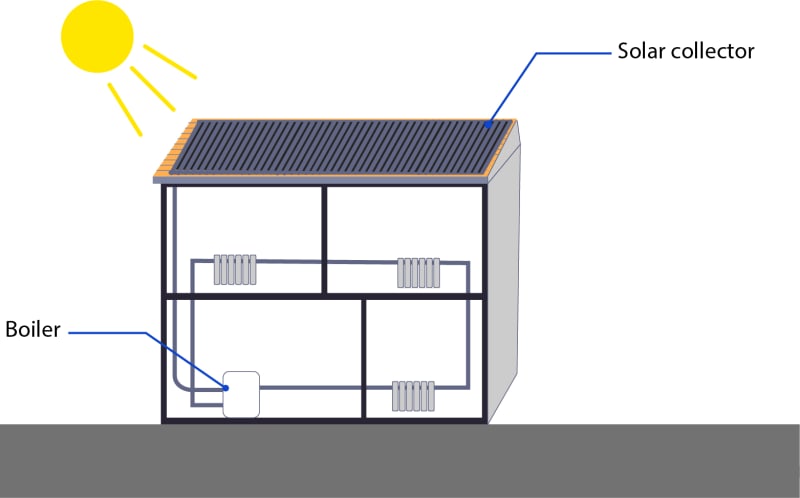 In sunny daylight the solar collector heats water to some degree by using energy from the sun and this heated water is connected to the boiler.