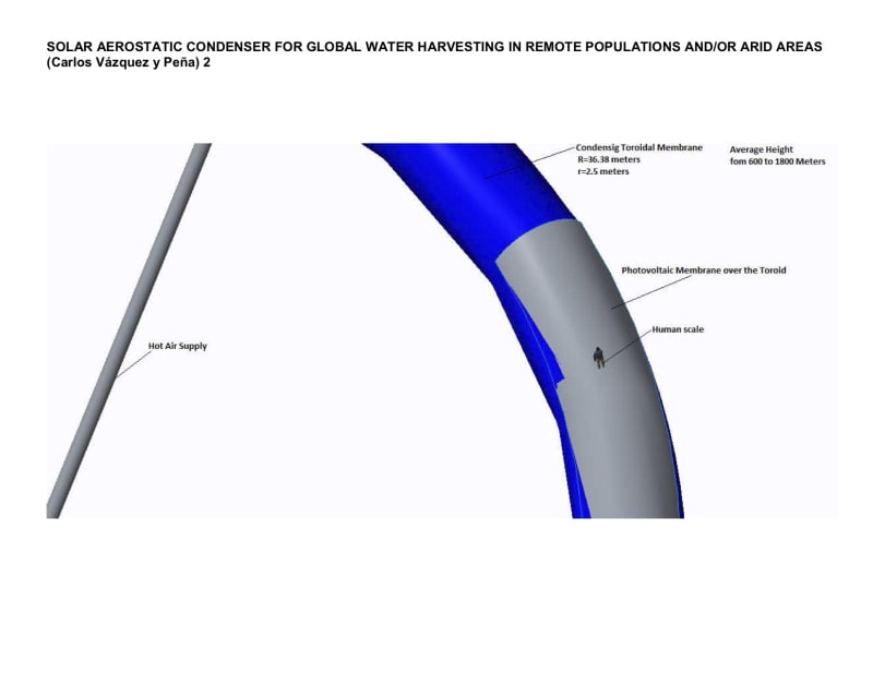 To harvest sustainable drinking water from water vapor in the atmosphere from 0 to 2 kilometers high, a torus-shaped membrane-based device is required that will condense water vapor from a heat exchanger and will take it by gravity to a water treatment unit, where it is purified thanks to solar energy and mounted solar photovoltaic panels and/or wind turbines, as well as filters for solids, filters for odors and flavors based on self-cleaning activated carbon and a UV unit, on the toroid and stored for consumption in tanks with a capacity of 5,000 liters at ground level that will supply drinking water for 400 people per day, purifying 8 cubic meters per hour. The scaling will be according to the population center served.