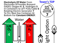 SENSOR Time-Released Buoyant Container-Sets EACH Fill With Hydrogen & Oxygen GAS From Electrolysis Of Water At Bottom Of Tower → Constantly Lifting UP Ropes (Cables) On Pulley-Blocks To Rotate Electric Generators To Electrolyze Water As A Constant Buoyant Gas Source.
