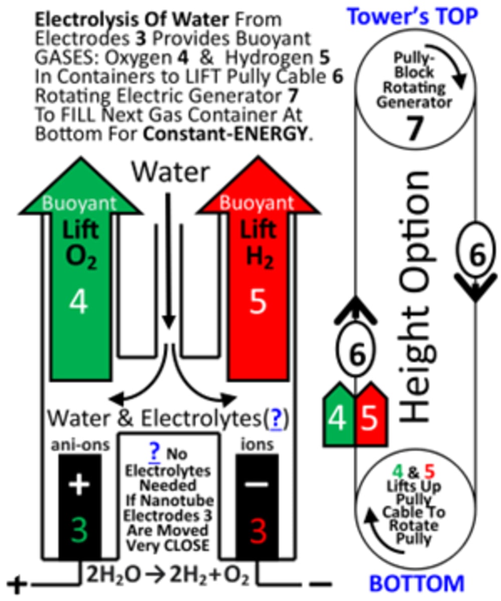 2nd Picture: Electrolysis Of Water From Electrodes 3 Provides Buoyant GASES: Oxygen 4 & Hydrogen 5 In Containers to LIFT Pully Cable 6 Rotating Electric Generator 7 To FILL Next Gas Container At Bottom For Constant-ENERGY.