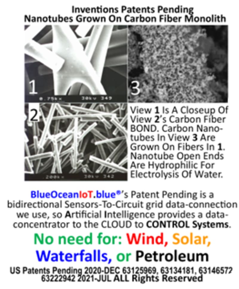 1st Picture: View 1 Is A Closeup Of View 2’s Carbon Fiber BOND. Carbon Nanotubes In View 3 Are Grown On Fibers In 1. Nanotube Open Ends Are Hydrophilic For Electrolysis Of Water.