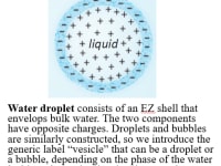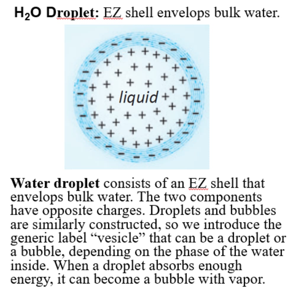Water droplet consists of an EZ shell that envelops bulk water. The two components have opposite charges. Droplets and bubbles are similarly constructed, so we introduce the generic label “vesicle” that can be a droplet or a bubble, depending on the phase of the water inside. When a droplet absorbs enough energy, it can become a bubble with vapor.