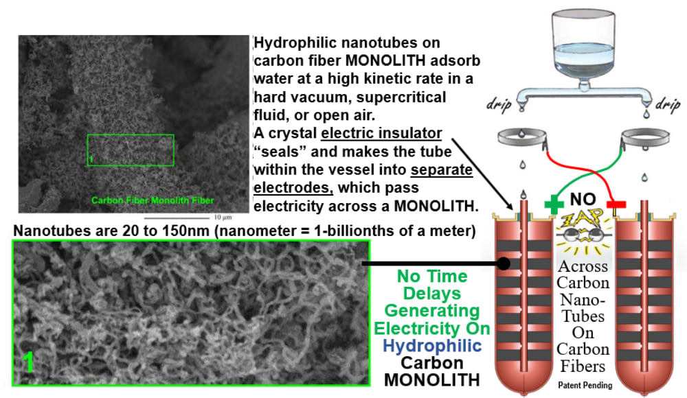 Hydrophilic nanotubes on carbon fiber MONOLITH adsorb water at a high kinetic rate in a hard vacuum, supercritical fluid, or open air.