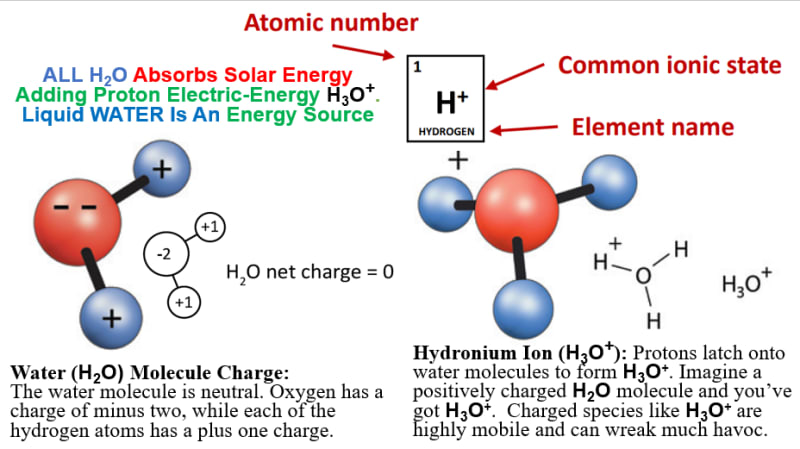 1st Picture: ALL H2O Absorbs Solar Energy Adding Proton Electric-Energy H3O+. Liquid WATER Is An Energy Source