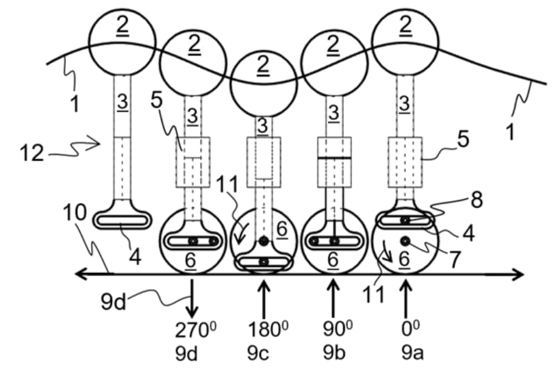 1st Picture: FIG 2 illustrates a side view of water waves 1 forcing a float 2 up and down reciprocating a Scotch Yoke mechanism 12 that is forced into motion by the water waves 1 moving under a floating structure 2 connected to the reciprocating motion mechanism comprised of: