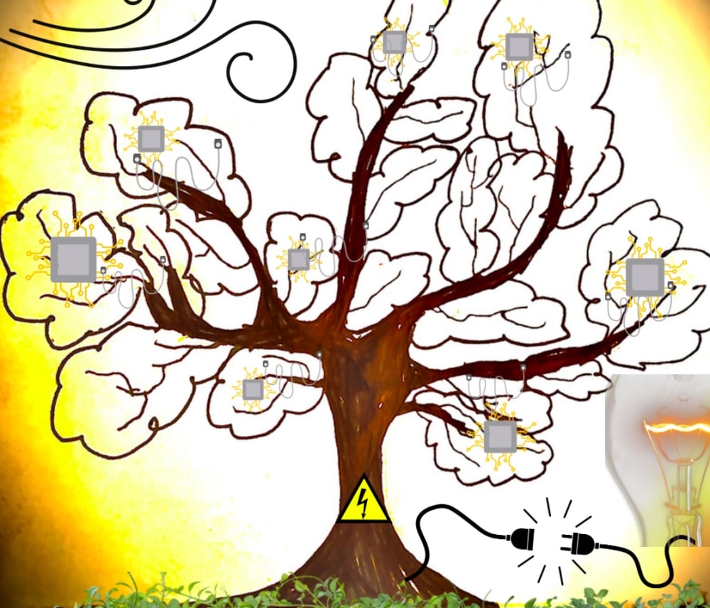 When the wind blows through the trees, the sensors collect energy and send a signal to computer hardware alerting of wind temperature and conditions like wind direction what direction and generating kinetic energy. The fan operates like a turbine that generates electricity from kinetic weather conditions such as strong wind. The sensors purpose is to detect and measure wind conditions and to assist on generating more energy sending it to a generator storage. The thin wires are used as a light weighted connectors attached along the branches to the sensors and fans. The fan operates like a wind turbine. Velcro is used for installIng the sensors and the fan. Velcro is a better option for installation because it can’t damage the trees branches. Velcro can be extended to reach The trees measurement of the width.