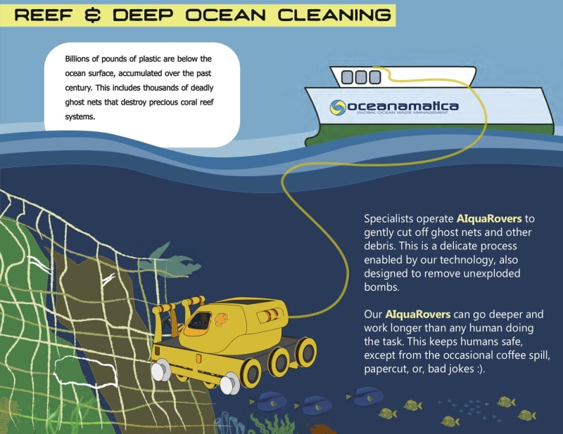 We have developed technologies to capture and process plastics from the open ocean and rivers. Our technology is unique in that it is minimally invasive, which is a very important aspect of working in the ecologies needed to be cleaned. As an added benefit, the captured carbons, in the form of plastics, are then able to be utilized for products.