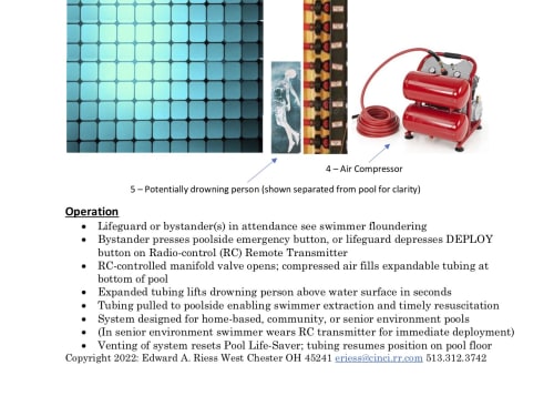 Expandable tubing grid resides on pool floor, ready to be inflated to lift potentially drowning person above water surface. One or more poolside emergency stations are provided, displaying appropriate signage instructing bystander(s) to press Life-Saver button to lift potentially drowning person to surface. Radio-controlled (RC) transmitter is provided for lifeguard use for same purpose.