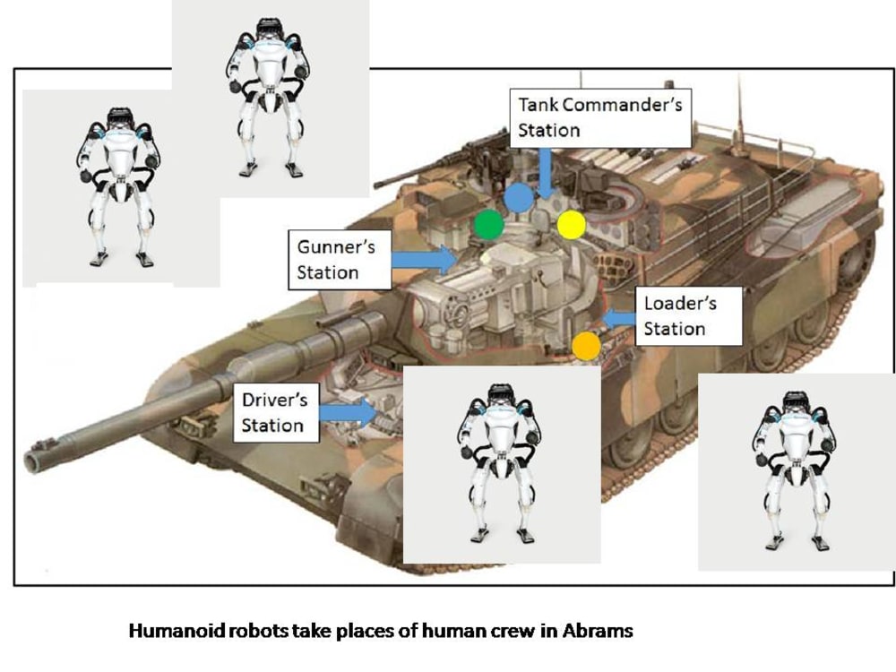 Solution. This novel solution uses Artificial Intelligence (AI), in two forms, to increase the tank force. Boston Robotics builds the Atlas robot, a humanoid robot, which could perform tank operations, including those outside the hull. The Atlas robot, with some modifications of its hands, and perhaps increase in limb strength, is a possible replacement for humans.