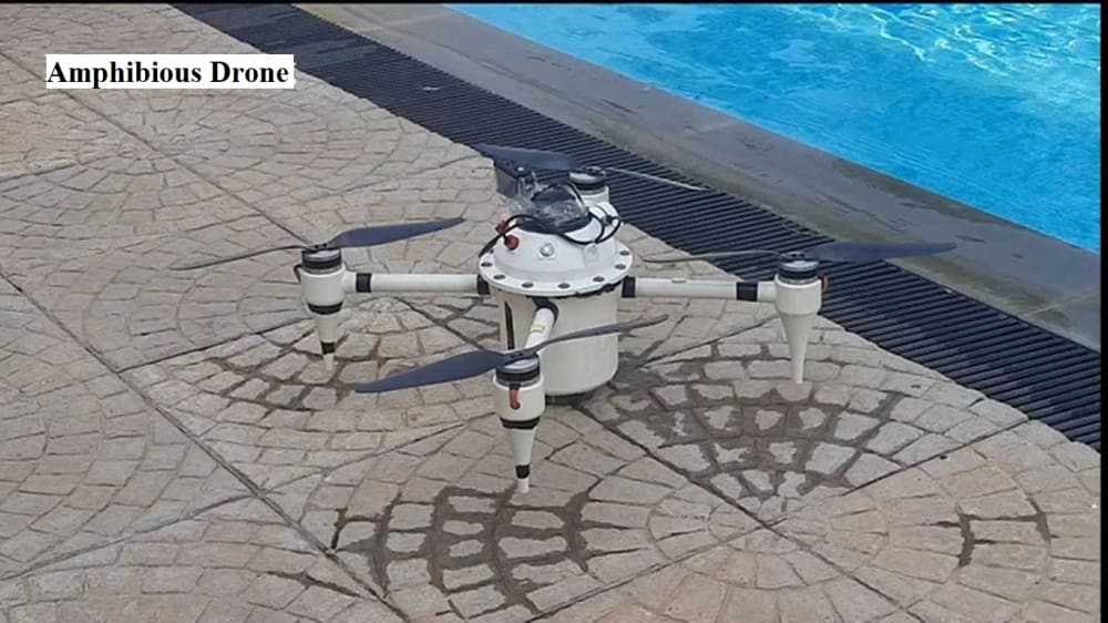 The Amphibious Drone with operational capabilities of surveillance and data acquisition both in underwater and air. The Objectives are to create a prototype that is capable of operating in air and under water, to demonstrate the capabilities of developed prototype for underwater surveillance, and to acquire and transfer the underwater data to the control station. The developed Amphibious Drone takes off from a ground station to the target location. Upon reaching the location, it sends real time situation at the target location. The drone lands on the surface of the water and begins to submerge. While submerged, the drone store the data on onboard storage and transmit it back to station when it resurfaces. The drone structure is completely leak proof.