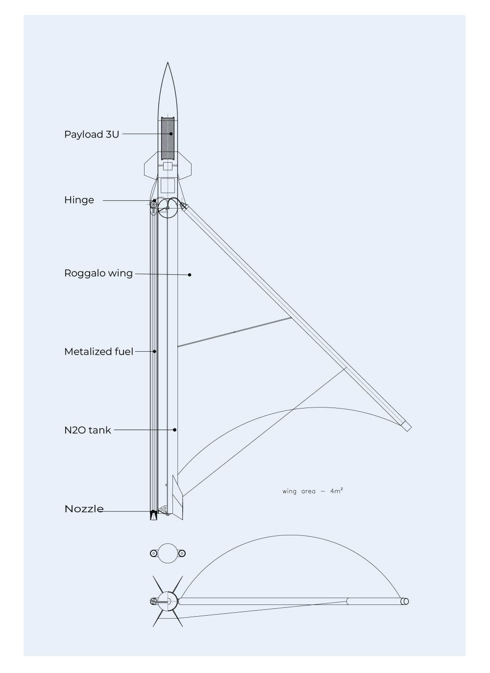 μLauncher features enhanced hybrid propulsion – Nitrous oxide popular as Party gas and metallised fuel. It will glide back to the Launchpad with a retractable Roggalo wing, low-cost IMU and non-ITAR GNSS autopilot. The main structure is made of commercially available carbon fibre tubes. The payload integration is simple and fast. The payload bay is a 3U CubeSat pod.
