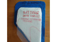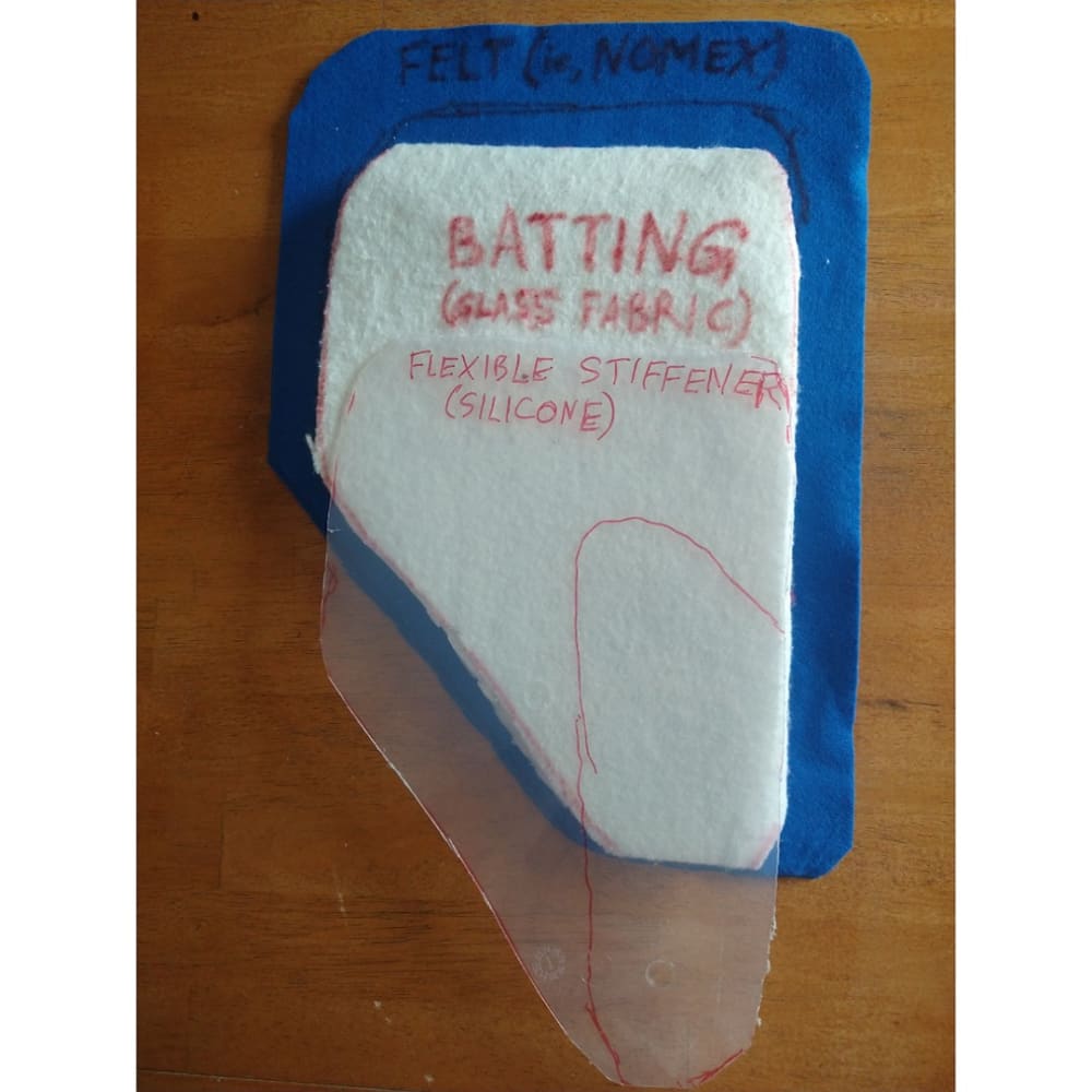 Prototype made of craft felt; quilt batting; plastic sheet; socks; Velcro straps and steel weight rods (Figure One). Glow tape stripes allow crew to locate each other in the dark. LED lights may also be attached.