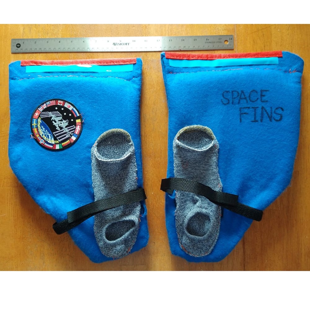 Space Fins are compact and stiffened internally to function like a swim fin in the air. They are wearable all day like a pair of bedroom slippers. Feet are inserted through soft straps or a sock, held securely but comfortably.