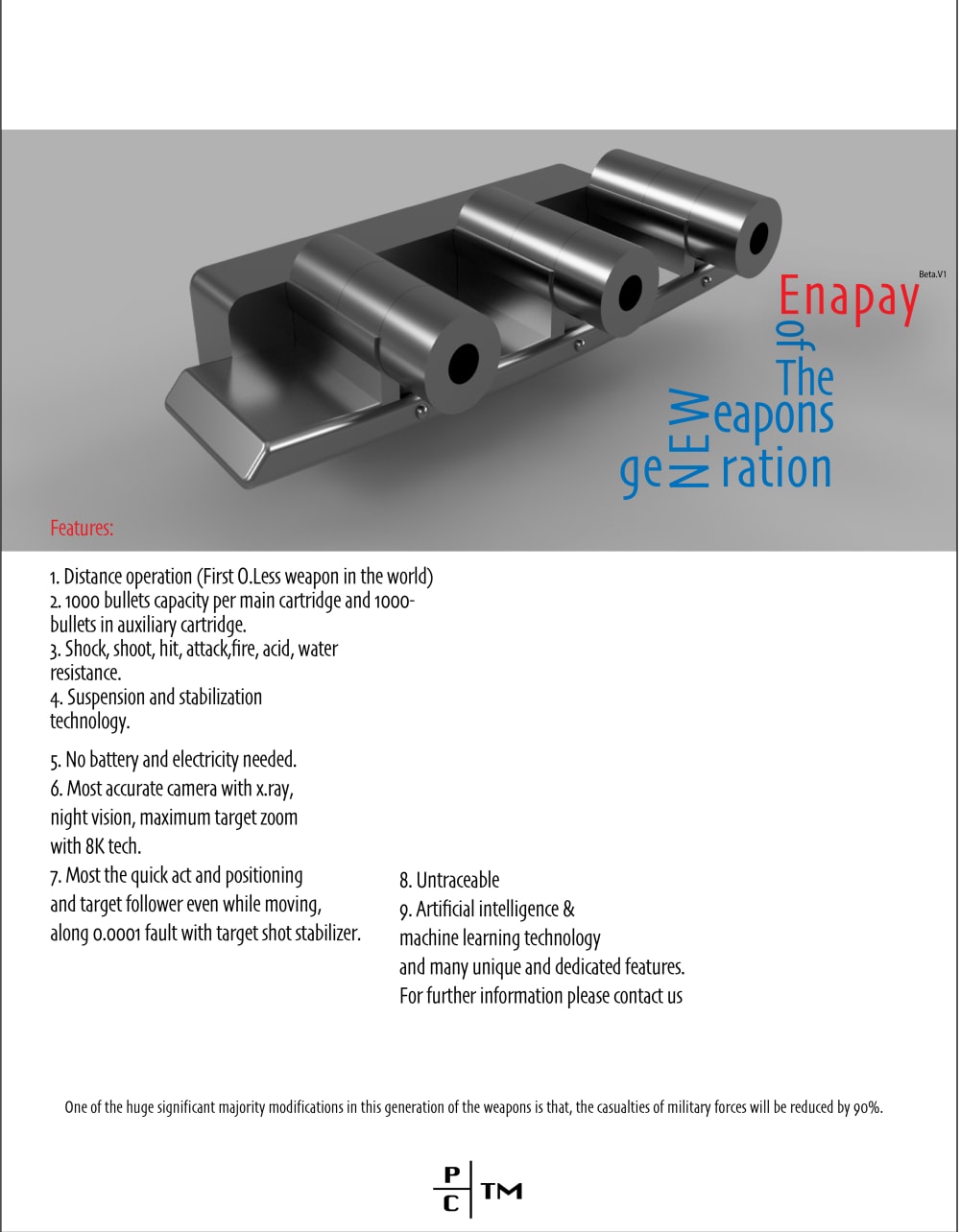 Introducing Enapay, the next generation of weapons that pushes the boundaries of innovation and technology. Enapay represents a remarkable advancement in weaponry, incorporating a range of cutting-edge features that redefine combat operations. With its unparalleled distance operation capabilities, impressive ammunition capacity, resistance to various elements, suspension and stabilization technology, self-sustainability, advanced camera system, untraceable nature, and integration of artificial intelligence, Enapay sets a new standard in the world of weapons.