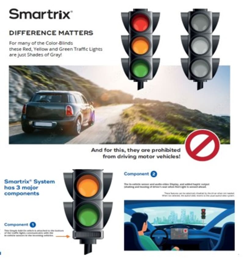 SMARTRIX® Traffic Light System in coordination with the In-Vehicle traffic light sensor- announce on the vehicle speaker and display on the monitor the color of the traffic light ahead for the color-blind drivers to hear– this enables and empowers the seriously color-blinds to “safely drive:”. It is the law under the Americans with Disabilities Act of 1990 (ADA) under Sections 12112, 12131(2) and 12132, which mandates that once SMARTRIX® becomes commercially available- that all the 17 million new vehicles sold in America annually must have SMARTRIX® installed and all traffic lights must the SMARTRIX® add-ons installed on them. The main concept of broadcasting the color of the traffic light for the color-blind driver to hear, as well as its many features are novel as evidenced by the issuance of a U.S. Patent# 10,755,562 on August 25, 2020, with other continuing-in-part U.S. and foreign patents pending.
