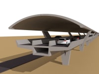 (2) NTS Hyperlink Guideway™ is a three-channel, elevated, covered roadway providing one channel for each direction and a third center channel, used when maintenance is needed on either of the directional channels. Its roof is covered with Solar panels for weather protection and provides 70 % of EV power. At only 37 ft. across, the Guideway will have a traffic capacity of a 20-lane interstate and will maintain a precise speed of 140 mph.