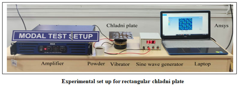 Ernst Florens Friedrich Chladni was a German physicist and musician. His most important work, for which he is sometimes labeled as the father of acoustics, included research on vibrating plates. Modal analysis is used to find out mode shapes and natural frequencies of system. This work aims at demonstrating nodes and antinodes at various frequencies of vibrations. Chladni plate is used for this purpose. When the plate is excited because of vibrations from a vibrator source, the sand of the plate creates specific patterns. These patterns are related to the excitation frequency. The sand on the plate moves away from antinodes where the amplitude of the standing wave is maximum and towards nodal lines where the amplitude is minimum or zero, forming patterns known as Chladni figures. The formation of patterns depends on material properties, geometry of plate, and thickness of plate and frequency/vibration pattern of the vibrator. The experimental setup consisted of a aluminum rectangular plate of 16 cm × 16 cm thickness of 0.61 mm placed over a mechanical vibrator (GelsonLab HSPW-003), which was driven by a sine wave signal generator (Ningbo Hema scientific). The procedure consisted in sprinkling powder on the plate and sweeping the frequency of the function generator until a constant pattern was obtained. Different shapes formed by sand particle on the plate at different frequencies will be captured by the camera. Validation of experimental work is done with ANSYS mechanical software.