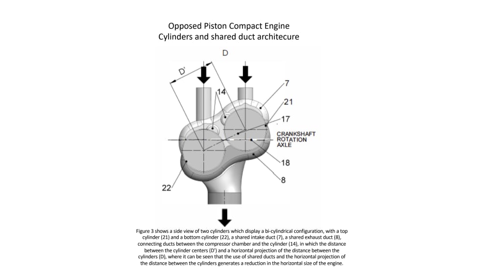 The Engine overcomes space restrictions for proper fitting of the OP-ICE arrangement in light duty vehicles.
