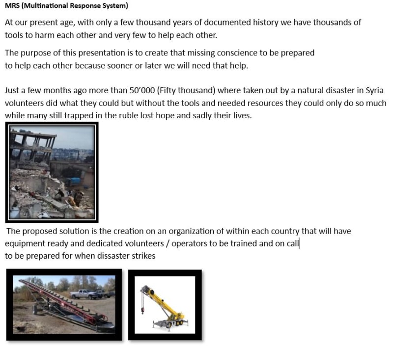 The proposed solution is the creation of an organization within each country that will have equipment ready and dedicated volunteers/operators to be trained and on-call and be prepared for a natural or man-made disaster.