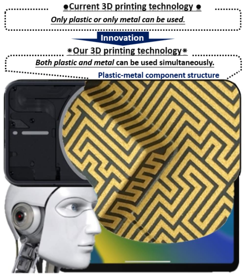 Existing three-dimensional (3D) printing technologies, whether polymer-based or metal-based, can only produce only-plastic structures or only-metal structures, which severely limits the application of additive manufacturing technologies (AM) in electronics such as IOT, ICT, and robotics. Electronic devices typically consist of both functional plastics and metals, including sensors and microactuators. They are connected together to manipulate the flow of electric current for the purpose of controlling information processing. With the proposed New Plastic-metal Composite 3D Printing Technology, these limitations can be historically broken. Our 3D printing technology enables the fabrication of both plastic and metal, allowing the metal topology designed on any complex functional plastic structure or even internal components. This can be in the form of 3D metal wires, metal patterns, topologies, or even large-scale structures with surface microstructures. Our technology is of potential importance both for academic research and industry. This is because it makes possible the integrated manufacturing of 3D electronic devices, which will make them smaller, lighter, and smarter with improved functionality and performance. This opens up a new world for the application of 3D printing technology in electronic technology.