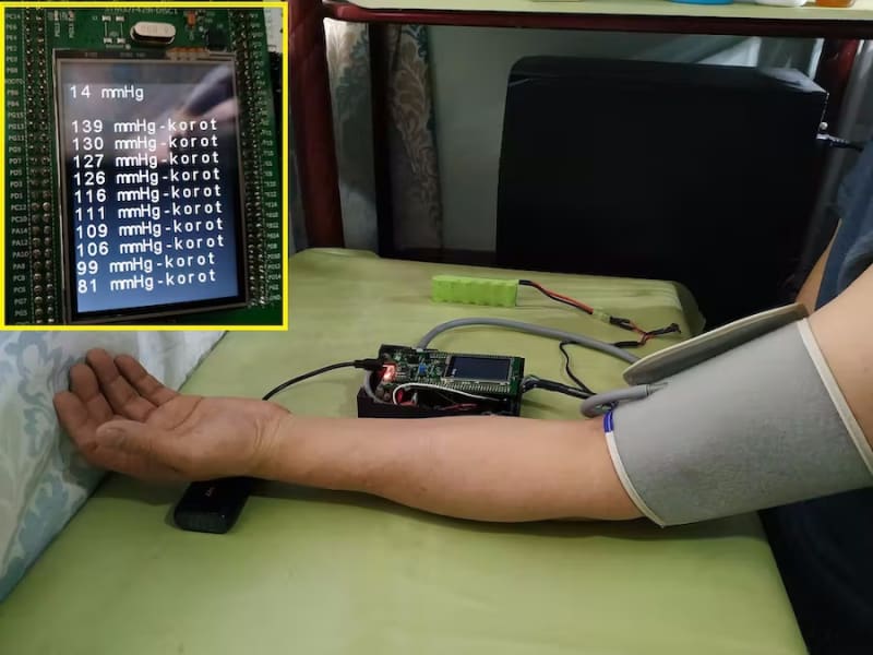 I once worked in a company that sells health-care devices and I've knowledge of how blood pressure monitors work. In this project I used a micro pressure sensor to detect Korotkoff sounds, which will help me to calculate systolic (maximum) and diastolic (minimum) blood pressure. There is another method called the oscillometric and I not used it for hardware reasons and time to finish it. However the oscillometric method is based on the Korotkoff sounds and each manufacturer develops its own mathematical algorithm to find systolic and diastolic pressures.