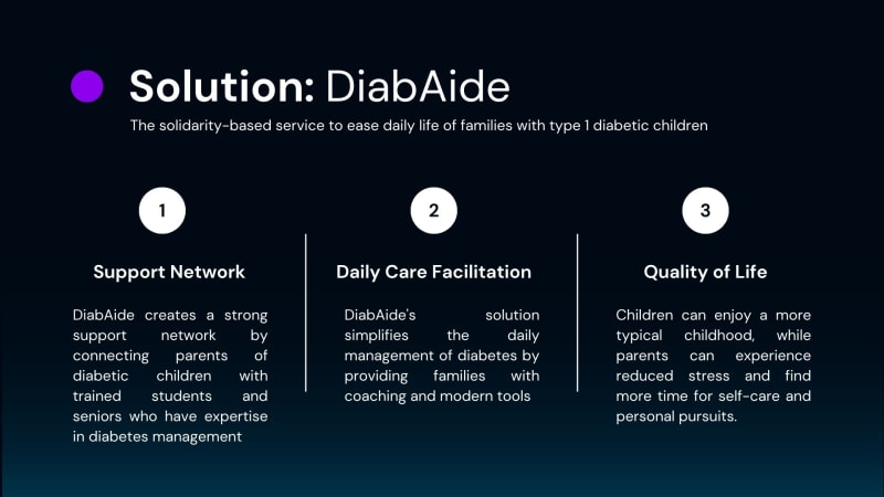 This innovation is based on a solidarity service that aims to facilitate the daily life of families while ensuring the academic and extracurricular success of their children. DiabAide distinguishes itself by offering a collaborative and intergenerational approach to the management of type 1 diabetes in children.