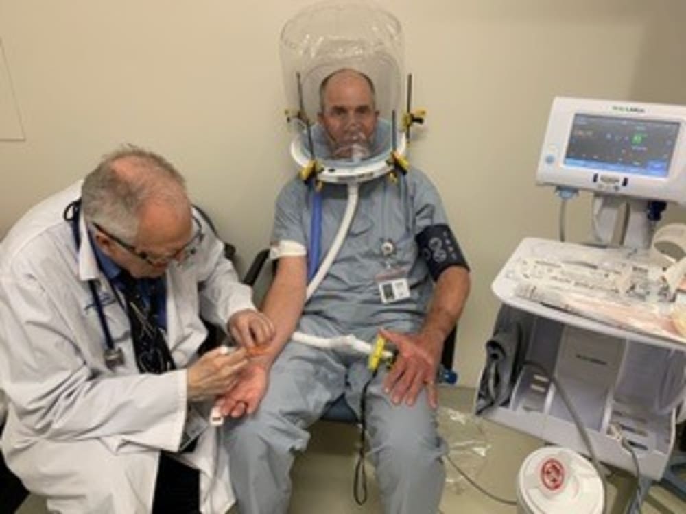 The CANADA HOOD is a compact, portable, hermetically sealed, non-invasive respiratory treatment medical device with an integrated internal Face Mask having separate gas flow and pressure adjustability from the main environmentally sealed Hood, separately protecting both the wearer, and anyone in the vicinity, from exchanging viruses and airborne pathogens, using only compressed air to operate.