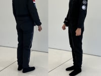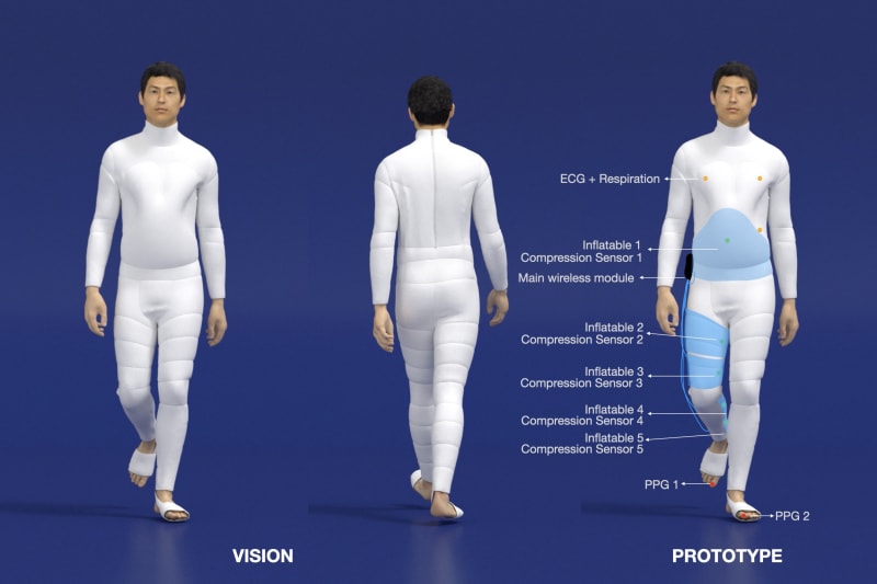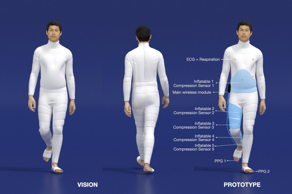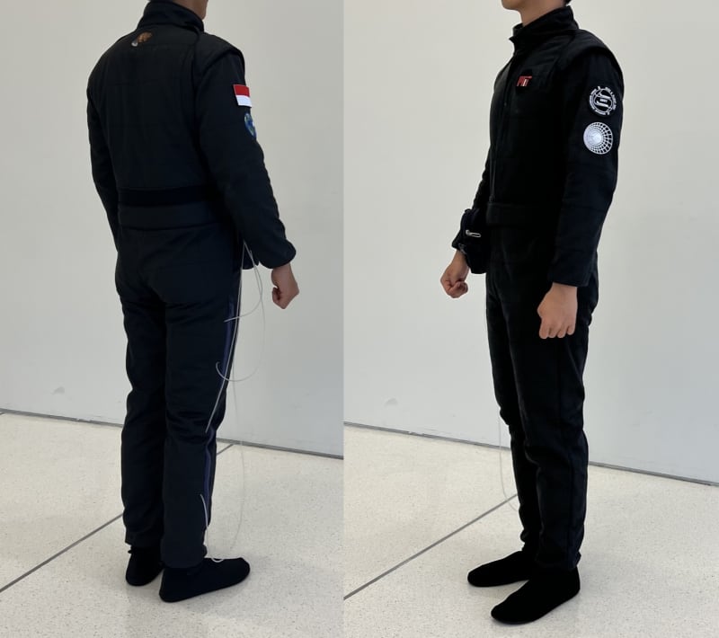 The PS-Suit outer layer is adapted from a high-performance Nomex racing suit (Profox) with a combination of knitted Nomex around the joints for freedom of movements and a double-layer quilt-woven Nomex throughout. The seams were cut and tailored based on the wearer’s body circumferences through 3D photogrammetry and measurement. The materials of the fabric with the forms of the suit ensure the overall protective and compression functionality, mobility, and comfortability of the PS-Suit for IVA. The inner-layer consists of an array of five inflatable chambers integrated by sewing inner 4-way stretch fabrics and embedding free-standing TPU bladders and five piezoresistive-based textile pressure sensors.