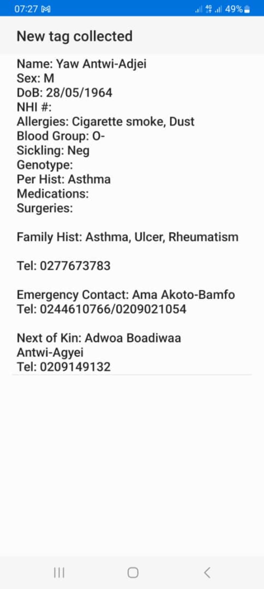 These will be captured in addition to patient's demographic (Name, Sex, Date of Birth, Residential Address, Personal Contact Details), Allergies, Current Medications, Previous Surgeries, Family History, Personal History, Next of Kin Details, Emergency Contact Details, National Health Insurance Number (if any).