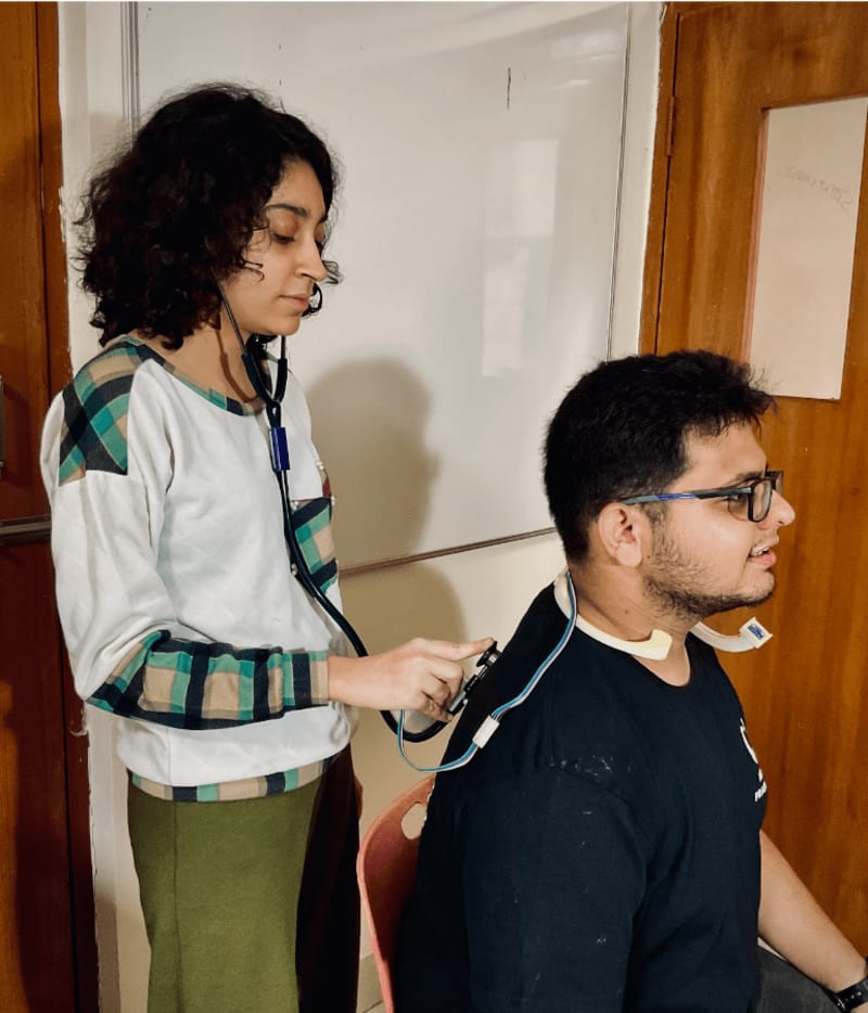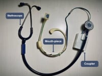 A prototype is built that can record breath sounds from the chest and mouth simultaneously. The recording is carried out at four locations of the chest (two anterior and two posterior). For five breath cycles at each location, it takes approximately 5-6 minutes for the complete recording. The product is under further development for recording quality and optimal product design.