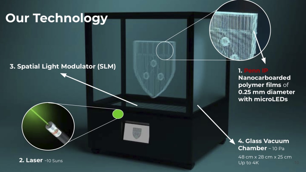 Our technology is a full-colored volumetric 3D display that will revolutionize surgical visualization. Based on IP from the University of Pennsylvania, the display’s pixels are microflyers - nanocarboarded polymer films of 0.25 mm diameter with payloads of colored microLEDs. These microflyers levitate to various altitudes upon incident laser light of 10 Suns intensity that has been patterned by a spatial light modulator (SLM). Their mechanism for levitation is photophoretic and is researched by the Bargatin group (we have their permission to use their technology). This is all packaged in a glass vacuum chamber to enable low pressures and prevent the laser light from escaping the box's coated polarizer.