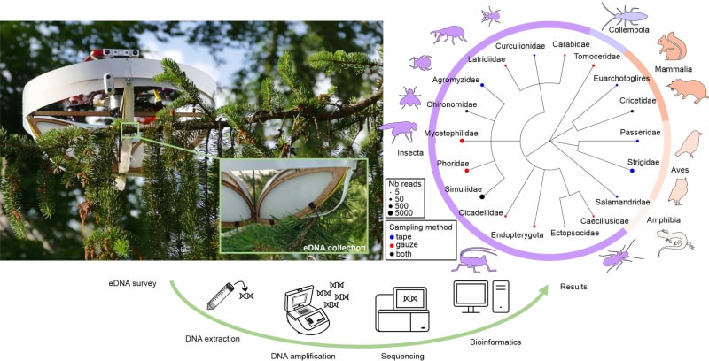 Collecting actionable data at relevant ecological and political scales is crucial for protecting global biodiversity and driving conservation and restoration efforts. Environmental DNA (eDNA) surveys are non-invasive and can detect multiple species from a single environmental sample (such as water, soil, and air), making them a vital tool in this endeavour. Biomonitoring with eDNA involves collecting environmental samples and sequencing the genetic material released by the taxonomic groups in that environment. However, in the case of terrestrial ecosystems, the process of collecting eDNA can be arduous and expensive due to the numerous surfaces and sources that require to be manually sampled, as well as the limited accessibility of certain regions. Forests are a prime example of these difficulties and remain largely unmonitored despite being a hotspot for biodiversity.