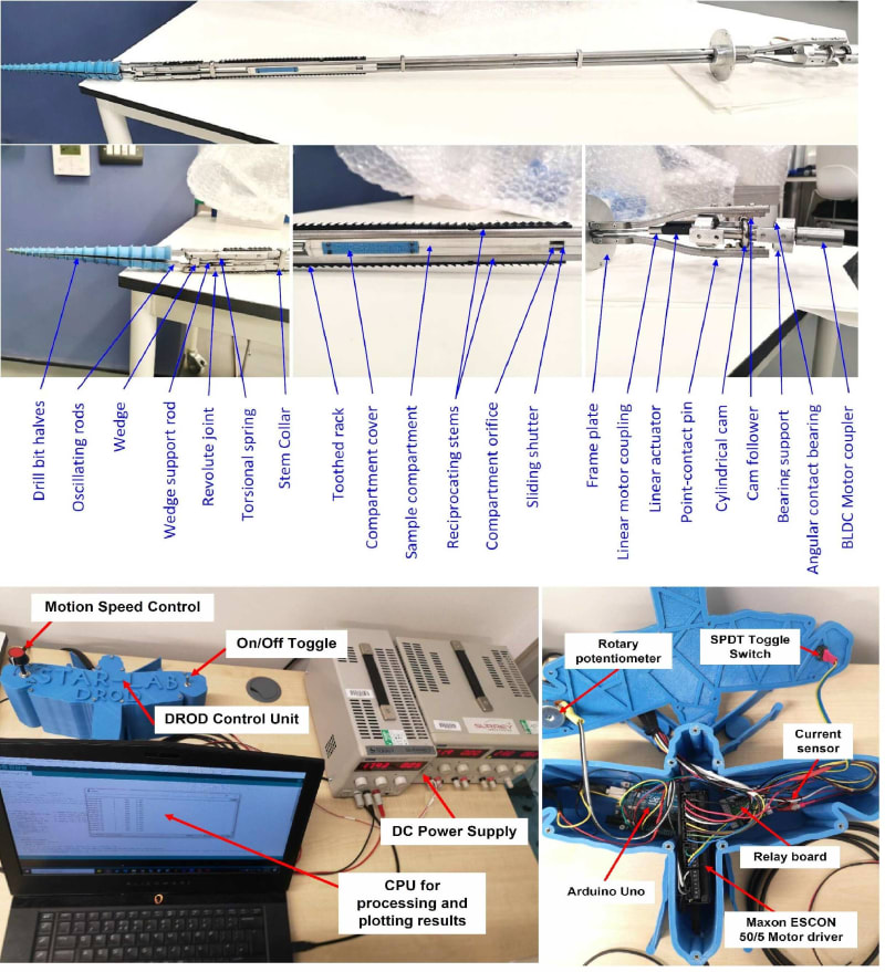 • The feasibility of the DROD has been proven by the kinematics and dynamics simulations produced by MATLAB and ADAMS. Finally, the effectiveness of different drilling motions was studied numerically using discrete element modeling and multi-body dynamic (EDEM-ADAMS) co-simulations. This revealed the underlying mechanisms of the drill–soil interactions. Finally, DROD has been tested for performing the tasks of penetration into the simulated soil, acquiring samples, and retrieving back. It is intended to be integrated with the exploration rovers in the future which will save much precious time wasted previously on the planets and save cost for the limited exploration spaceships.