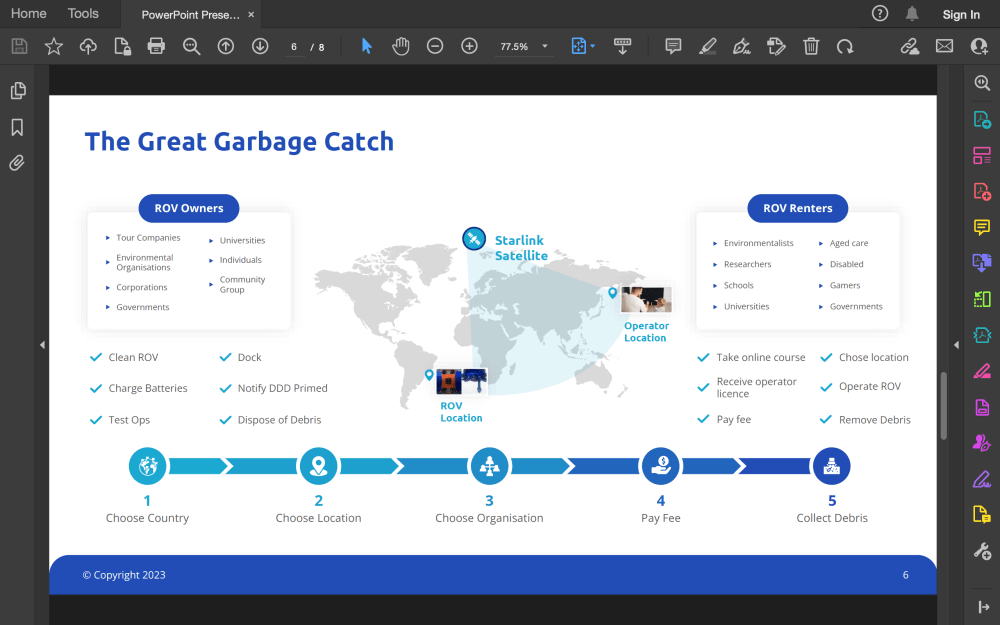 The use of Starlink, offers a reliable and efficient way to control the ROVs, enabling marine debris collection in real-time. This rental business model allows users to rent ROVs at a lower cost than buying an ROV outright, a unique approach to collecting marine debris.