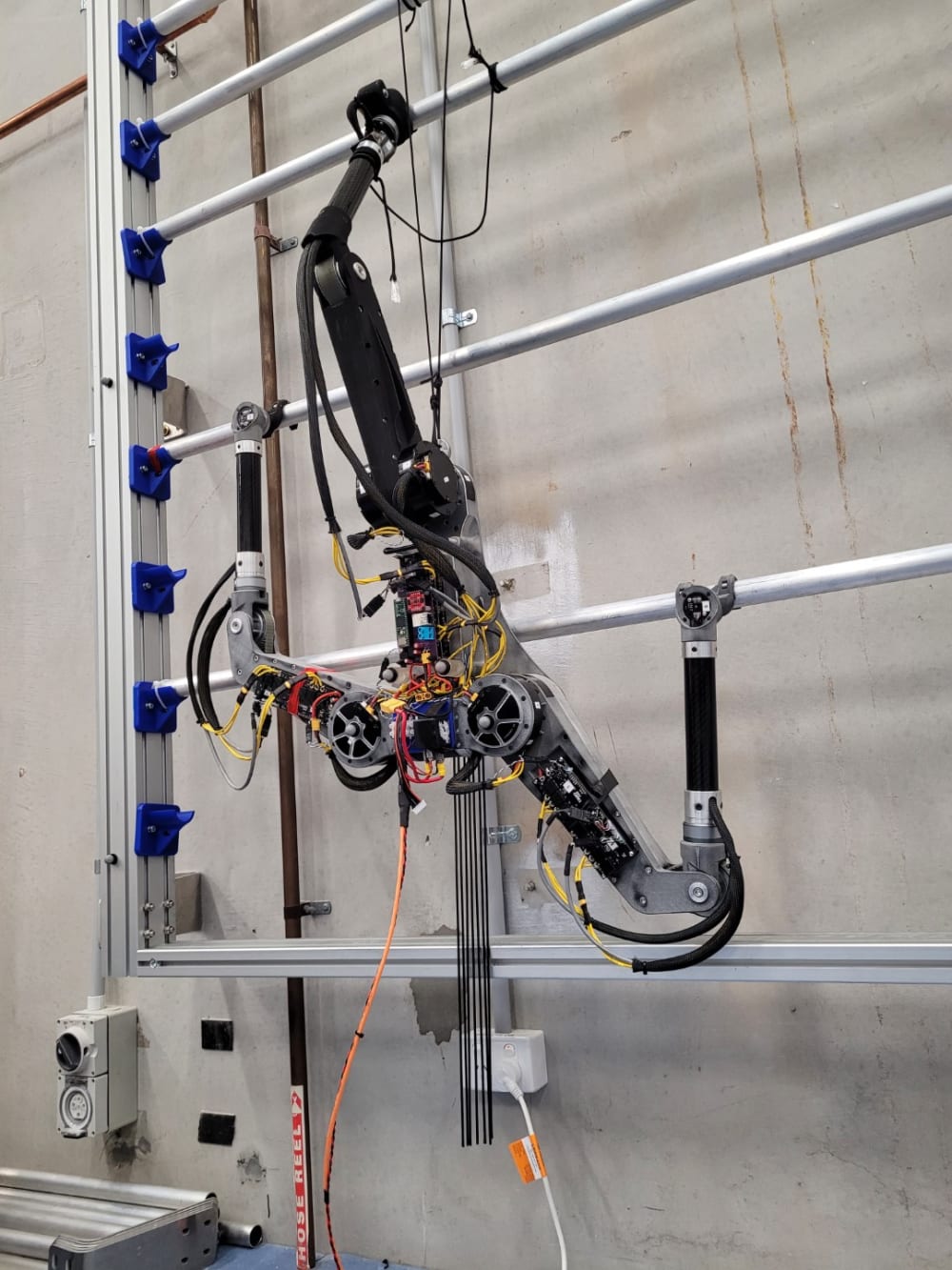 ParCli (PARrot CLImbing robot) is the world's first parrot-inspired climbing robot developed by Clyde Webster at the University of Technology Sydney. ParCli is unique in that, like a parrot, is uses three-limbs for locomotion, with the center-limb being larger, stronger, and having more dexterity, with the intention that in future revisions it will be used for mobile tool manipulation, like blasting, grinding, cutting, drilling, welding, and more. ParCli is being used as a research platform to validate the design philosophy, control methodologies, and planning algorithms necessary to create a work-capable climbing robot. It has 14 brushless DC motors, a 6800mAH battery, and is made of a combination of laser sintered nylon (a directed energy deposition technology), machined aluminum, fabricated steel, and carbon fibre. ParCli weighs roughly 10.5 kg, and in its most stretched out configuration (from beak to foot) has a length of 1.69m.