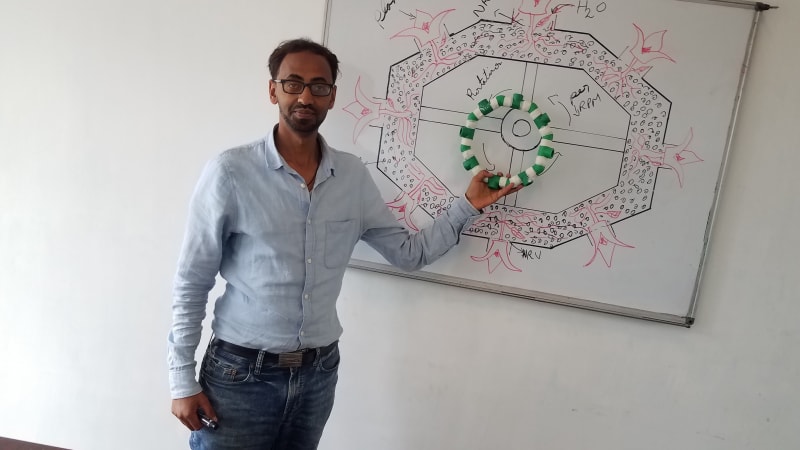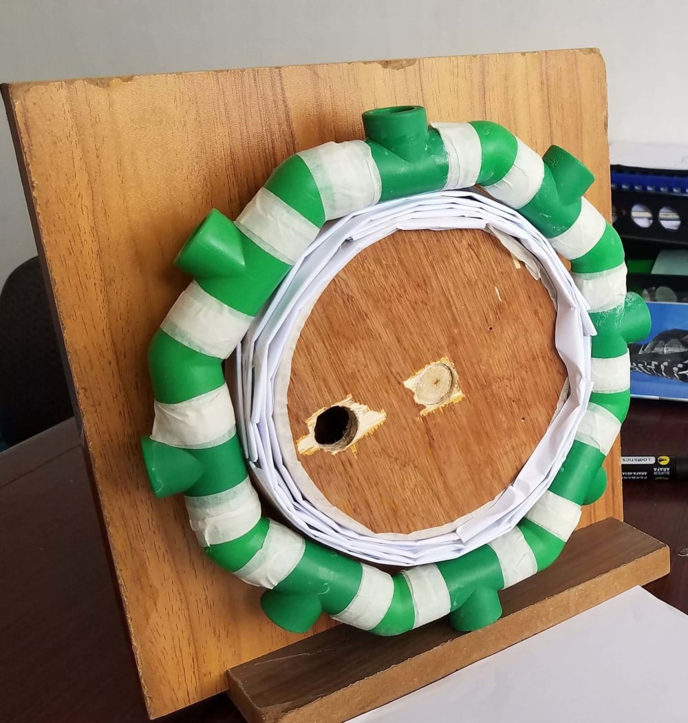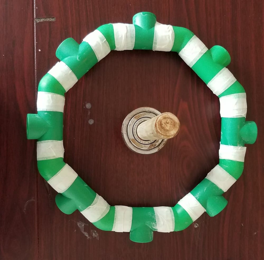 This project is about new kind of plant growing mechanism that utilizes water 100%. This is done by using a standing octagonal piping system containing soil inside of it having plants placed at each side as seen in the figure which is a front view. As seen in the whiteboard drawing, watering the eight plants is done on the top opening of the structure. Then because of gravity water travel downward watering the side and bottom plants in both right and left sides. As the water starts to cumulate on the bottom area as seen in the drawing, we turn the octagonal structure 180 degrees so that the top of the octagonal piping will be at the bottom. This will reverse the movement of the water accumulated at the bottom watering the sides and bottom again. This system will be repeated until all the water inside the soil will be absorbed and used by the eight plants consuming the water 100%. The center of the octagonal piping structure is attached to a rotary bearing system which can be either manual or automatic depending upon power availability.