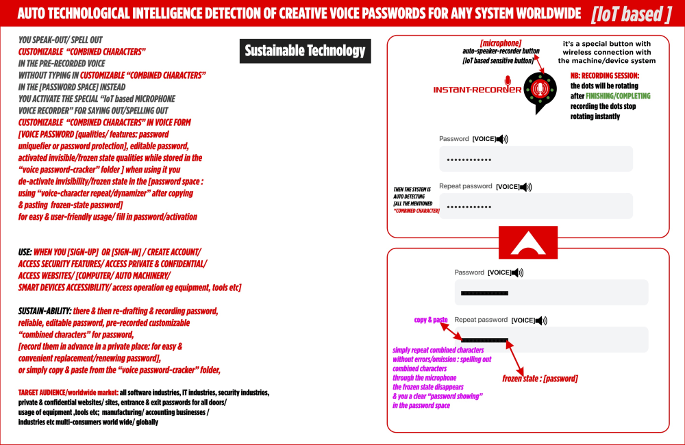 [VOICE PASSWORD [qualities/ features: password uniquefier or password protection], editable password, activated invisible/frozen state qualities while stored in the “voice password-cracker” folder ] when using it you de-activate invisibility/frozen state in the [password space: using “voice-character repeat/ dynamizer” after copying & pasting frozen-state password] for easy & user-friendly usage/ fill in password/activation