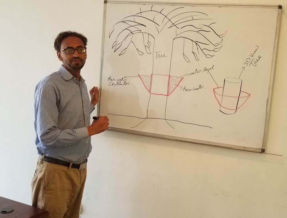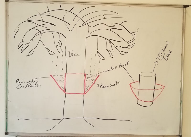 This project is about building a cheap structure that can be installed on the trunk of every tree that can collect and store rain water to act as a primarily self-defense against wildfire to put out the fire using the collected and stored rain water without the need of human intervention. As seen in the first draft white board drawing, a light but durable hollow like cone structure is installed on every tree at average elevation of the steam and as rain comes the water will be collected because the structure will force some of rain water inside of it. As time passes, since the leaves of the tree block much of the sunlight evaporation will be low saving the stored rain water being consumed. When fire breaks out in the forest, each trees will save themselves using the stored water because the cumulative of stored rain water at each tree will be enough to control or limit the fire from escalating because moisture is an enemy of fire.