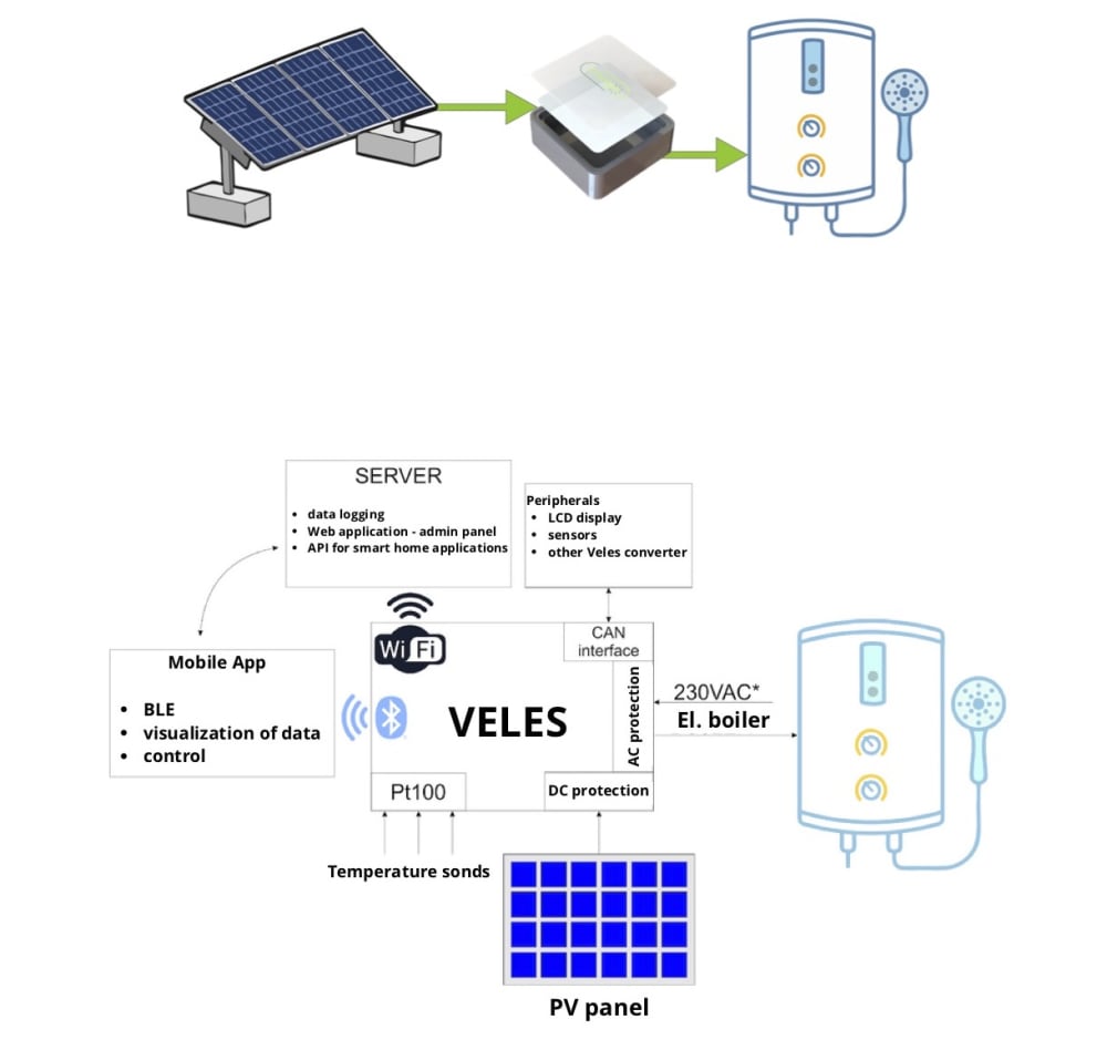 Veles is a smart converter designed to increase the water heating efficiency of photovoltaic panels that the user will be able to control through the application. By analyzing the user's use of water and heating, the converter will adjust the parameters using machine learning in order to achieve as much savings as possible, it will give advice for both monetary savings and education, and will contain the functionalities of protection against failures.