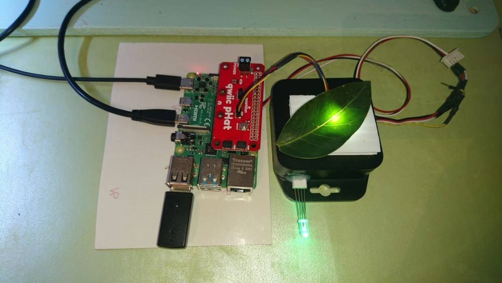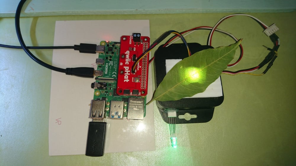 This project uses the AS7263 NIR (near infrared) spectrometer sensor and the Raspberry Pi 4B board to assess plant foliage health. It explains how to uses the sensor’s channel readings and the standard Normalized Difference Vegetation Index (NDVI) equation to calculate an estimated NDVI value. Also prints the value and a “HEALTHY” or “UNHEALTHY” statement, and turns ON an RGB LED to green or red to indicate whether the foliage is healthy or not, respectively. Finally, it saves the test data into a CSV format file. The latest version includes a real-time IoT monitoring to share the captured information to the whole world in the internet cloud.