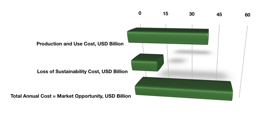 According to the "Inclusive Wealth Report, 2018" by Pushpam Kumar of the Earth Institute at Columbia University (link in References), while global GDP increased about 95% from 1992 to 2018, that is to $80 trillion, IWI decreased about 35, equaling $29.47 trillion in 2018. As of now, 99+% of food packaging films are environmentally hazardous, and about 70% end up in landfills and the oceans. Thus, out of the 14.8 million metric tons produced and used, costing $106.6 billion, about 10.36 million tons, worth $74.6 billion, directly contribute to environmental degradation and loss of sustainability. Adding the estimated value of the 35% drop in IWI, as it relates to the percentage loss of sustainability attributable to $39.4 billion worth of food packaging films, we arrive at the following total annual cost: