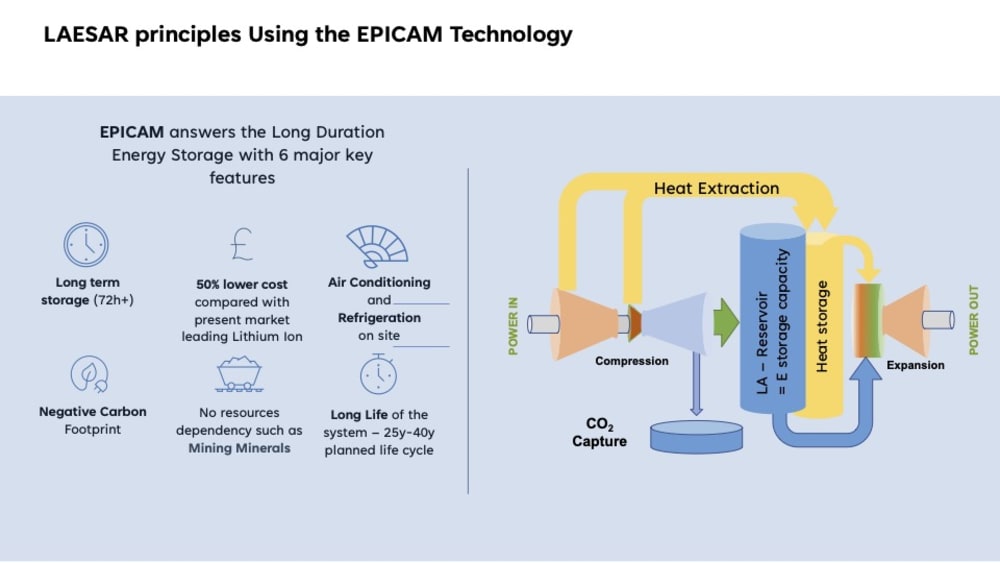 Cryogenic extraction of greenhouse gases CO2 and CH4 is also incorporated in the liquefaction process at negligible additional cost. LAESAR is thus substantially carbon negative over its lifetime. It will profitably provide storage on global power grids with a CO2 biproduct extracted from the atmosphere. Wind turbines will step-change by powering the liquefier directly to maintain maximum storage of energy and simplify the management of demand and supply on the grid. Within a few years, CO2 extraction could reach the IPPC target of 10 gigatons per year and before 2050 the 500 gigatons required to complete the repair of Earth’s climate could be achieved using LAESAR, avoiding the multi-trillion dollar costs of extraction by alternative filtration processes.