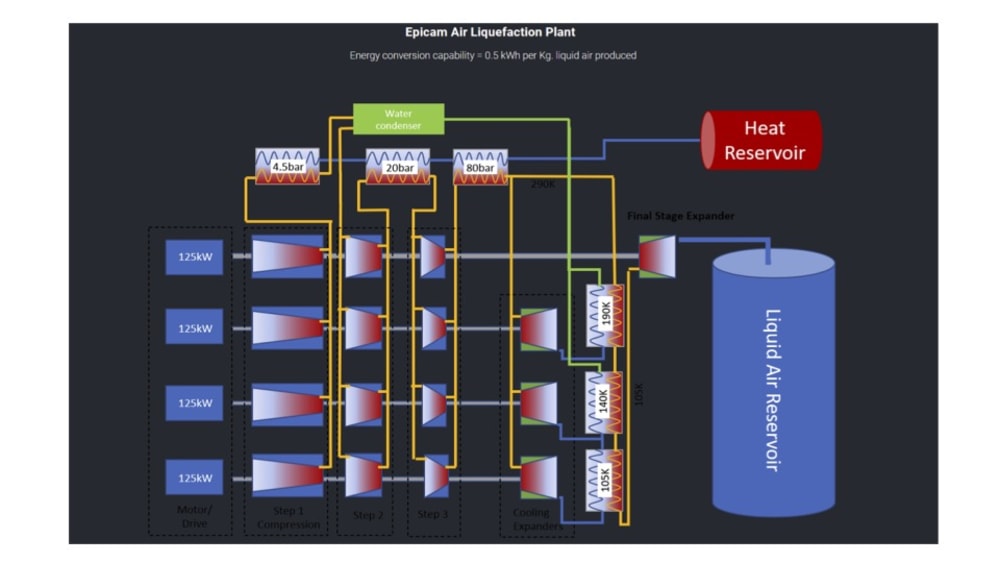 LAESAR follows the pioneering initiative by Highview power to introduce liquid air energy storage in the power industry. As a new first competitor, LAESAR offers advantages in both efficiency and scalability while using an essentially similar process. However, the novel paired rotor displacement devices which deliver LAESAR’s improved air compression and expansion, contrast sharply with the turbomachinery used by Highview. I invented these rotary devices, which have been developed in-house, patent protected and proven effective by my Company Epicam. Manufactured practicably by additive techniques, their unique feature is their ability to achieve volume change in compressible fluids by displacement action without internal mechanical friction, using only small rotor-rotor and rotor-stator clearances of 5 – 25 microns as illustrated by the compressor model in Fig 1. The layout of the liquefaction system is shown in Fig. 2 with its 3-stage compression to 80 Bar, cooling supply and power recovery via single stage expanders. A schematic of the complete system is shown in Fig. 3.