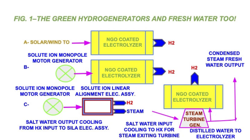 (2) Application of Coulomb’s Law electrostatic repulsion via solute ion linear alignment (SILA) ion beams to also produce H2 in a combined process with the NGO electrolyzer with both powered by solute ion monopole motor (SIMM) as 24/7 renewable power source with no CO2 emissions or excess power battery storage or grid access requirements.