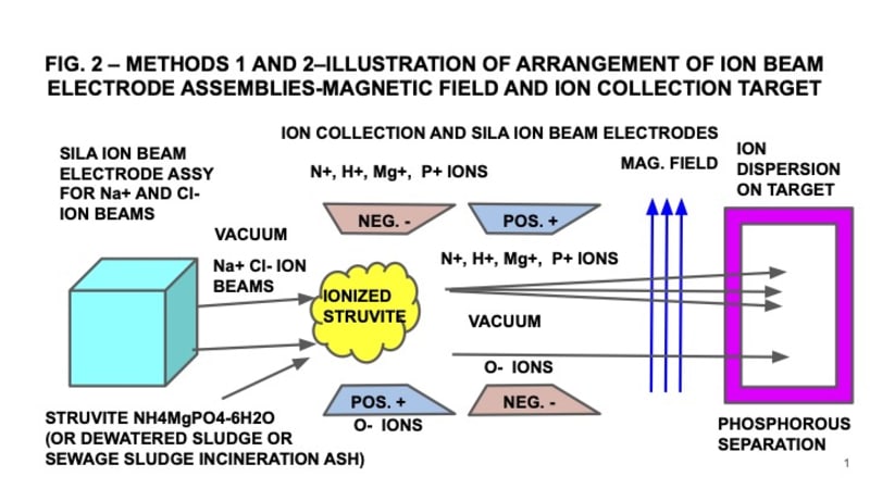 FIG. 2 Phosphorus Recovery for Agriculture via Solute Ion Linear Alignment Ion Beams Decomposition of Struvite, Dewatered Sludge and Sewage Sludge Incineration Ash