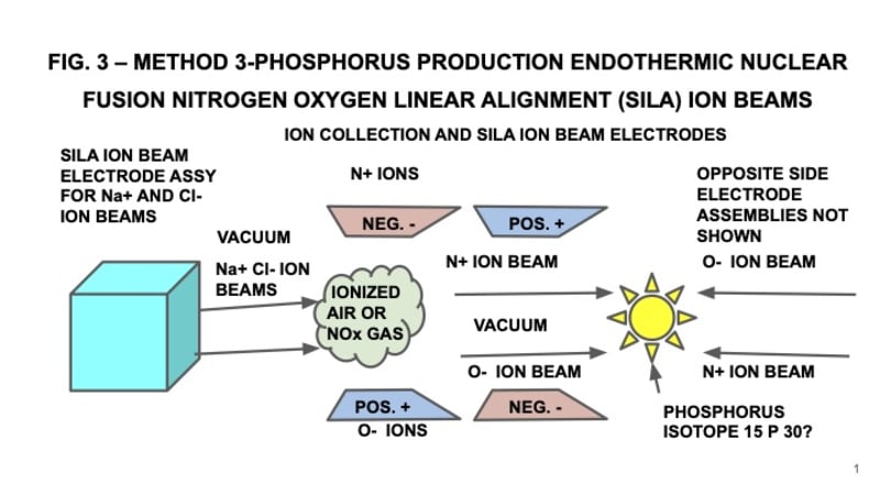 Utilizing the approach shown in this website of endothermic nuclear fusion, it may be possible to produce an isotope of Phosphorus 15 P 30 by similarly separating a gas such AS AIR (78% NITROGEN 21% OXYGEN) OR NOx via heavy ion beams such as sodium and chlorine thereby forming N+ and O- ion beams that could be caused to intersect and fuse into the Phosphorus 15 P30 isotope. Thereby, very common substances such as nitrogen and oxygen readily available from air could be used to form phosphorus.